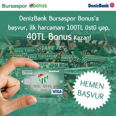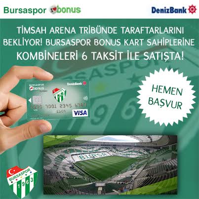 Bursaspor kulübü ve denizbank ın bursaspor taraftarına sunduğu bursaspor bonus kart ile hem bonus avantajlarından faydalanıp hem de takımınıza destek olabilirsiniz. Bursaspor bonus kartlar temassız ödeme. Bursaspor bonus ile yapılan her alışverişte hem kulüp hem de taraftar kazanıyor. Bursaspor ve finansbank ortaklığından ortaya çıkan cardfinans bursaspor takımını saha içinde olduğu kadar saha dışında da desteklemek isteyen taraftarlara pek çok imkanlar sunuyor.